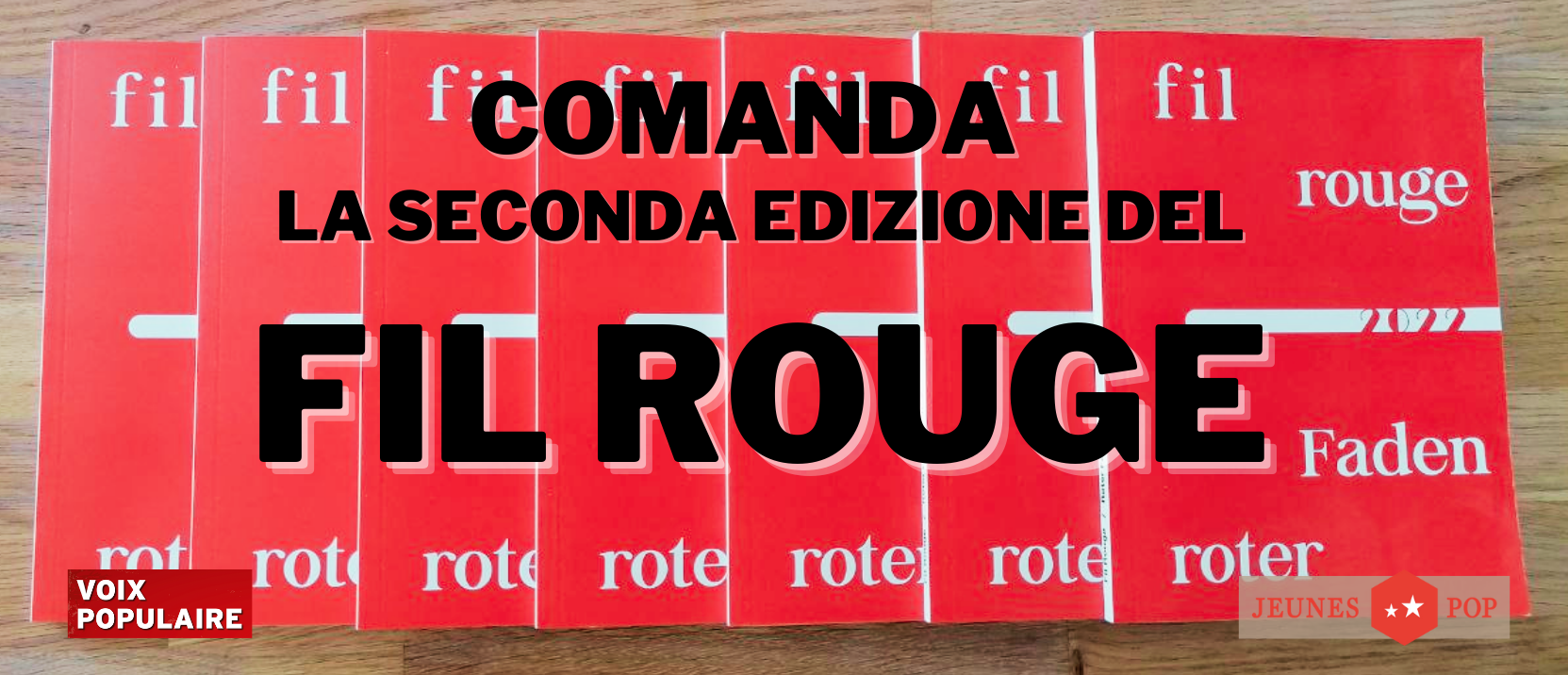 È arrivata la seconda edizione di Fil Rouge, una rivista marxista creata in collaborazione tra i Giovani POP e il mensile Voix Populaire. I diversi articoli trattano i temi discussi durante il weekend di formazione Form’action dei Giovani POP: si parla di sistema sanitario svizzero, ecologia, marxismo, economia e urbanismo. Non aspettare oltre, ordina ora la seconda edizione di Fil rouge, stampato in francese, italiano e tedesco. Il pagamento dev’essere effettuato tramite la fattura inviata in allegato con il libro.